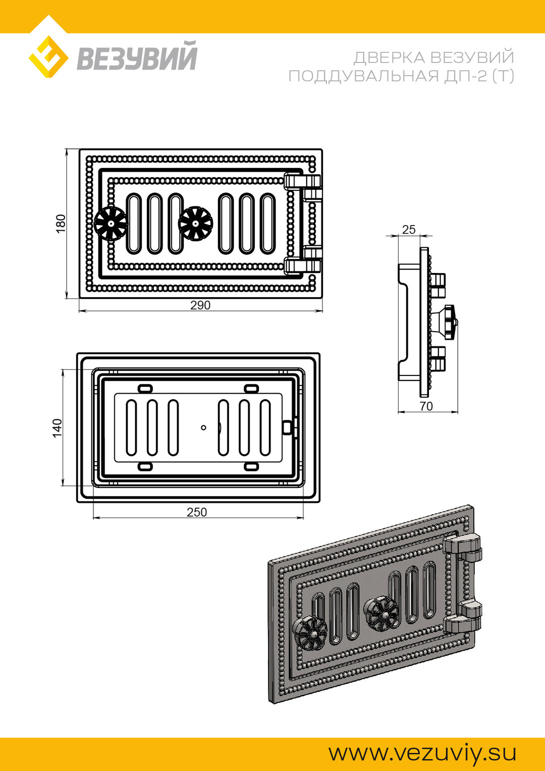 Двери изготовлены из качественного чугуна по ГОСТ 1412-85, производятся в комплектациях с глухим полотном или стеклом. Ручки дверей также сделаны из чугуна.
