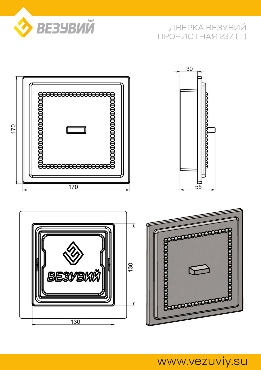 Дверца Везувий изготовлена из чугуна по ГОСТ 141285. На корпусе имеется чугунный декоративный элемент, который выполняет роль strengthening ребер и защищает изделие от деформаций. Конструкция позволяет монтаж двери с обоих направлений: открывание вправо или влево. Дверцы Везувий выпускаются как без покрытия, так и окрашенными в черный цвет (антрацит).