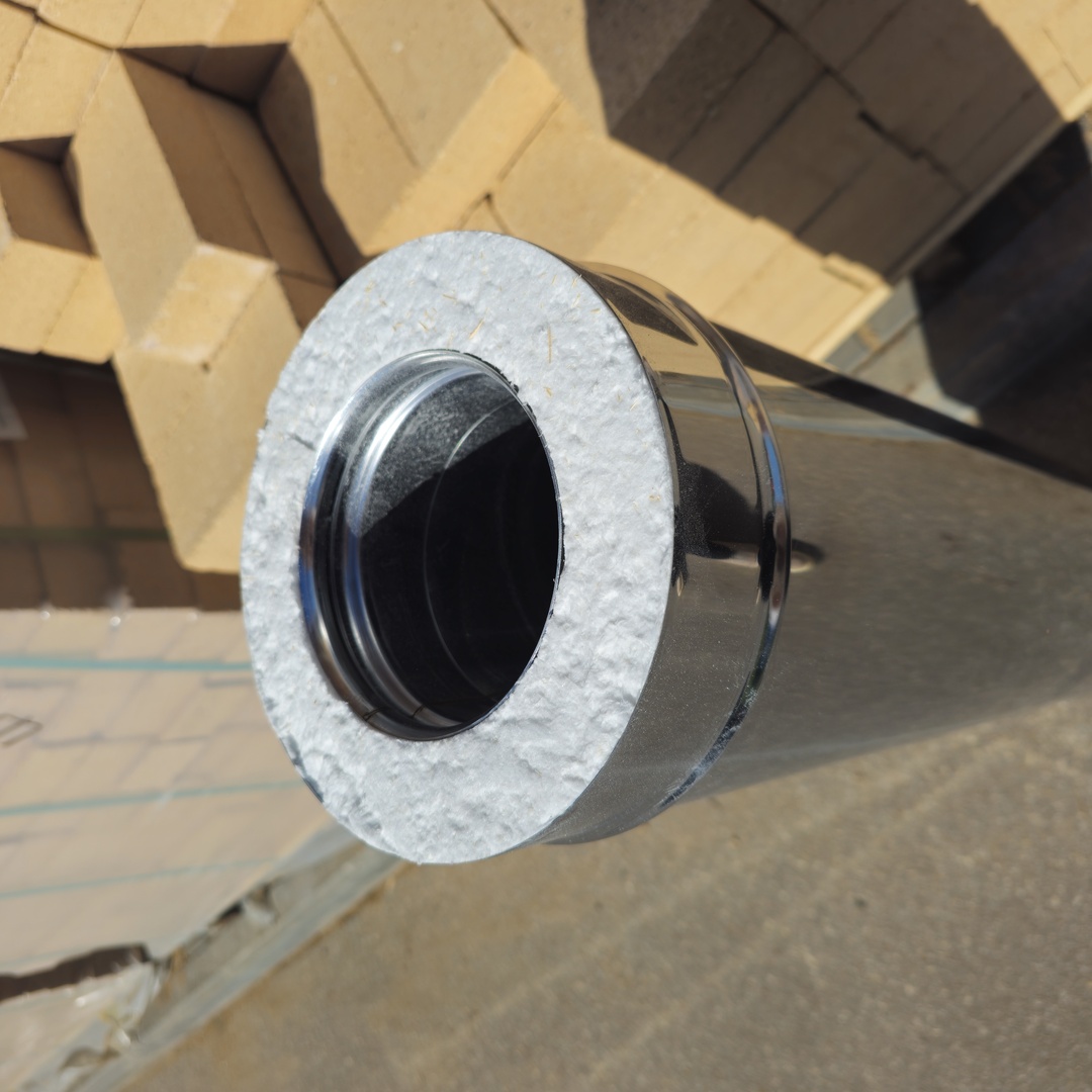 Утепленный элемент предназначен для отвода дымовых газов на неотапливаемых прямолинейных участках дымохода. Важно! За счет раструбов полезная длина элемента на 60 мм меньше, чем номинальная. Внутренний контур изготовлен из аустенитной нержавеющей стали AISI 430 толщиной 1,0 мм.