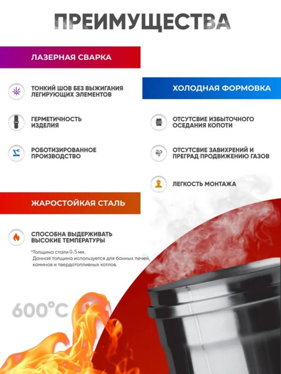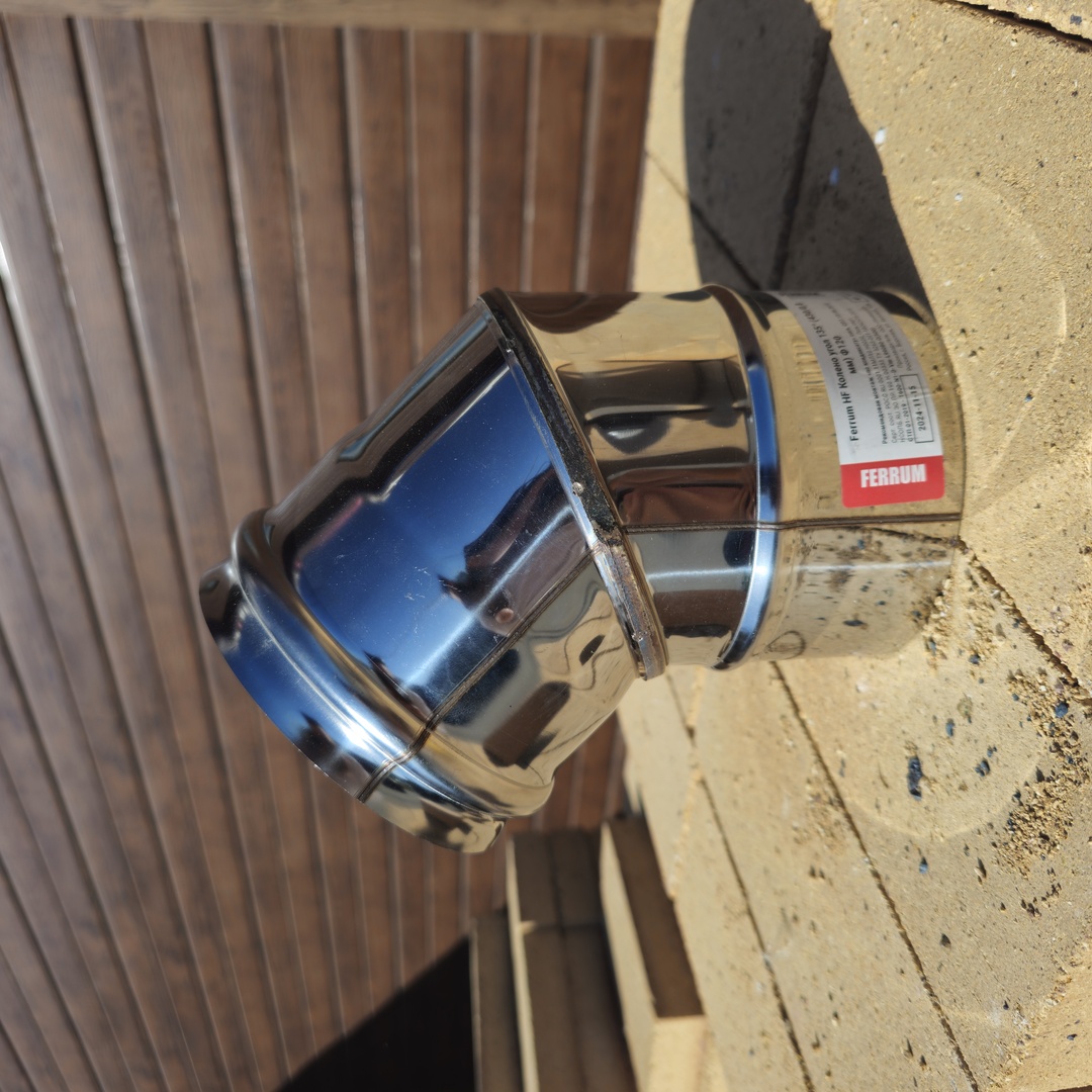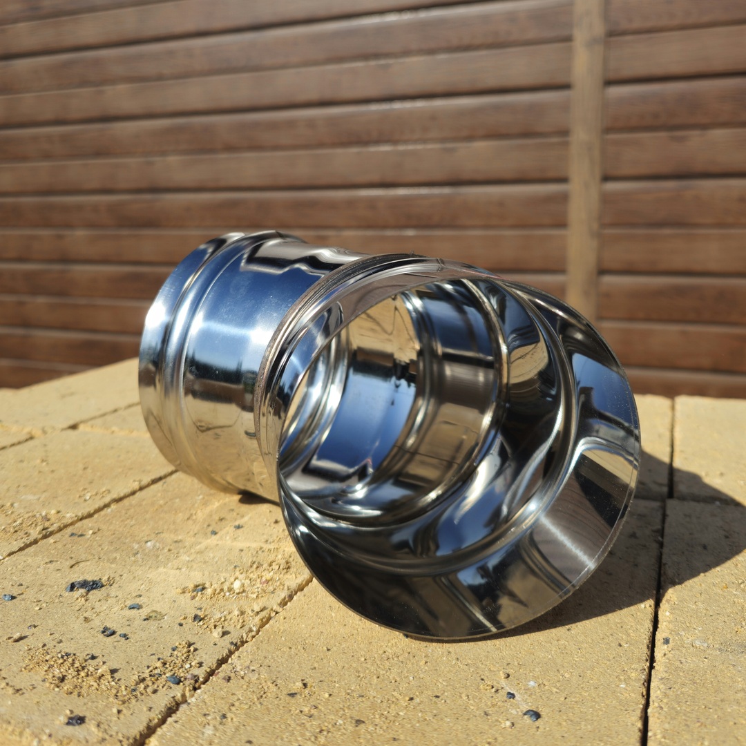 Колено угол предназначено для изменения направления дымохода или смещения его в сторону под углом 45 градусов. Элемент изготовлен из нержавеющей стали толщиной 0,5 мм, марка стали AISI 430. На продольных швах применена лазерная сварка, на поперечных контактная сварка.