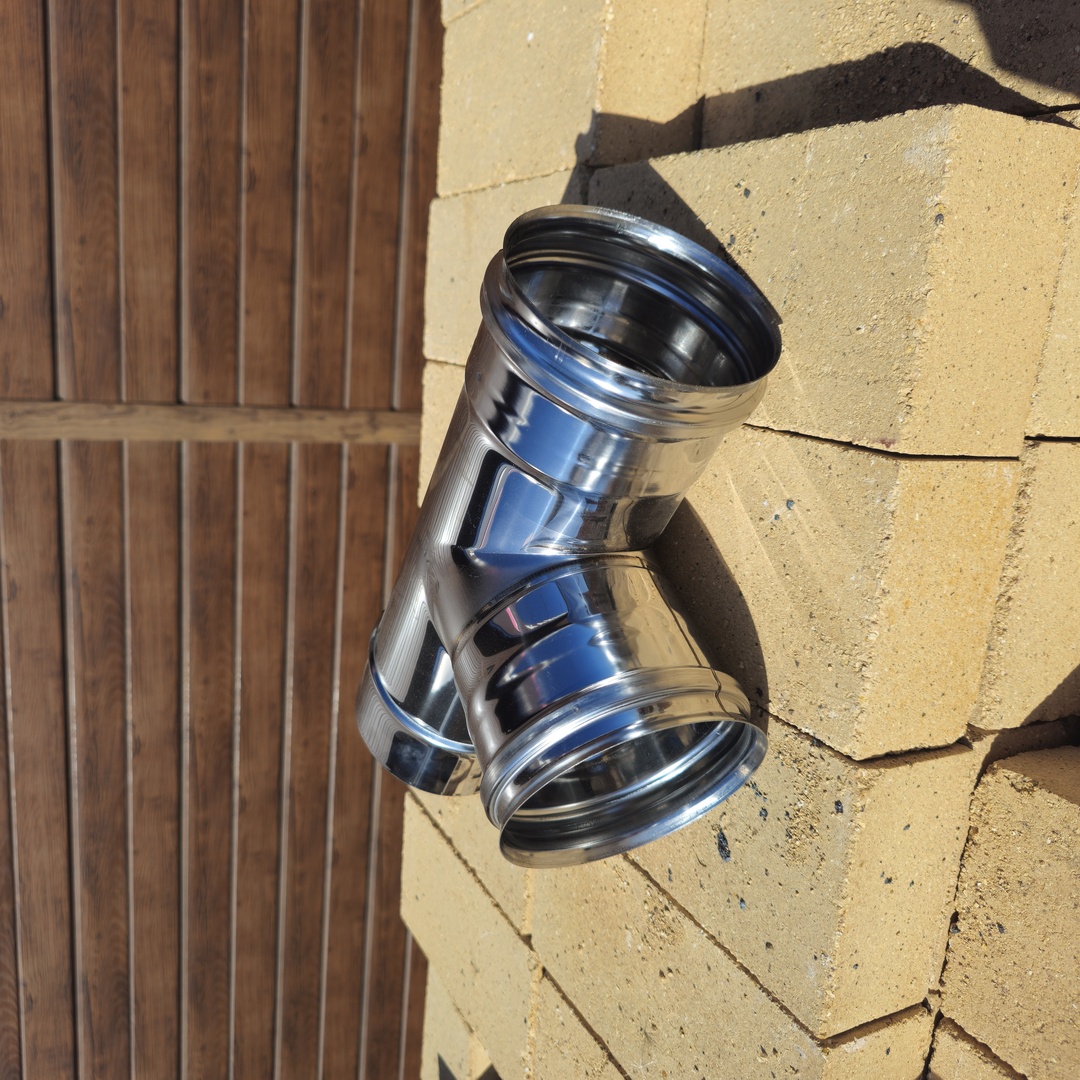 Также тройник образует карман для ревизии (прочистки) и обслуживания дымохода и скопления там сажи и мусора, не препятствуя движению дымовых газов.
