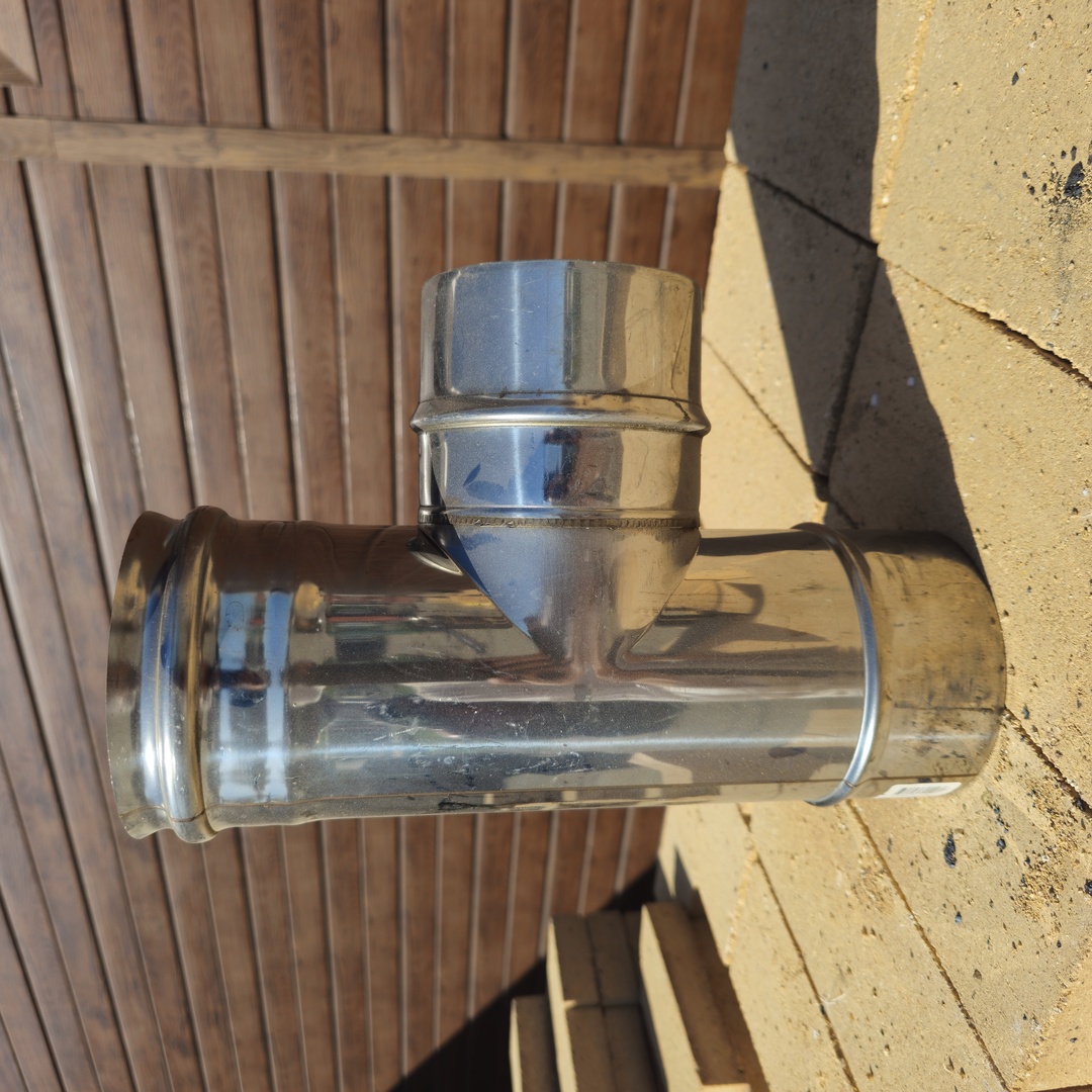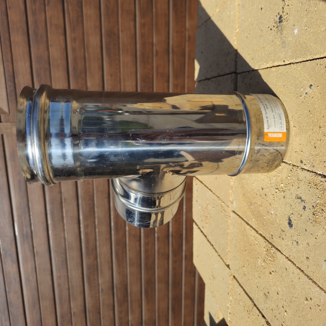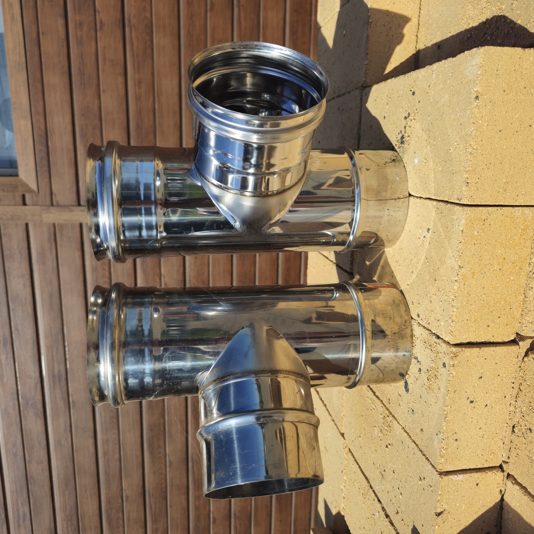 Также тройник образует карман для ревизии (прочистки) и обслуживания дымохода и скопления там сажи и мусора, не препятствуя движению дымовых газов.