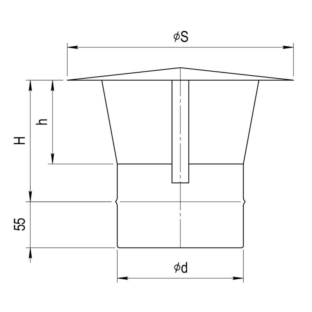 Зонт является завершающим элементом одностенной дымовой системы. Устанавливается в раструб последней трубы (наличие раструба обязательно), т.к. у зонта элемент "папа", для которого необходим элемент с раструбом.