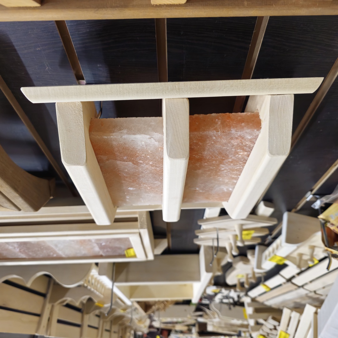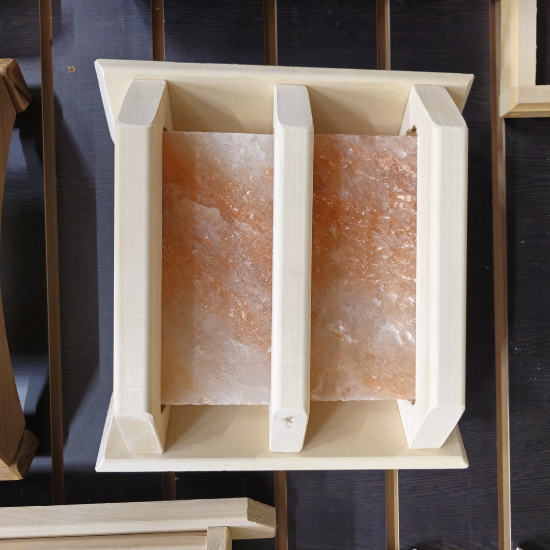 Абажур "Гималайская соль" №2 Липа - приятно теплый и естественный облик. Абажур выполнен из светлой липы, которая дарит интерьеру банного пространства теплоту и уют. Естественная текстура дерева подчёркнута контрастной вставкой из плитки гималайской соли, добавляющей ярко-розовые и тёплые оттенки, а также мягкое, рассеянное свечение.