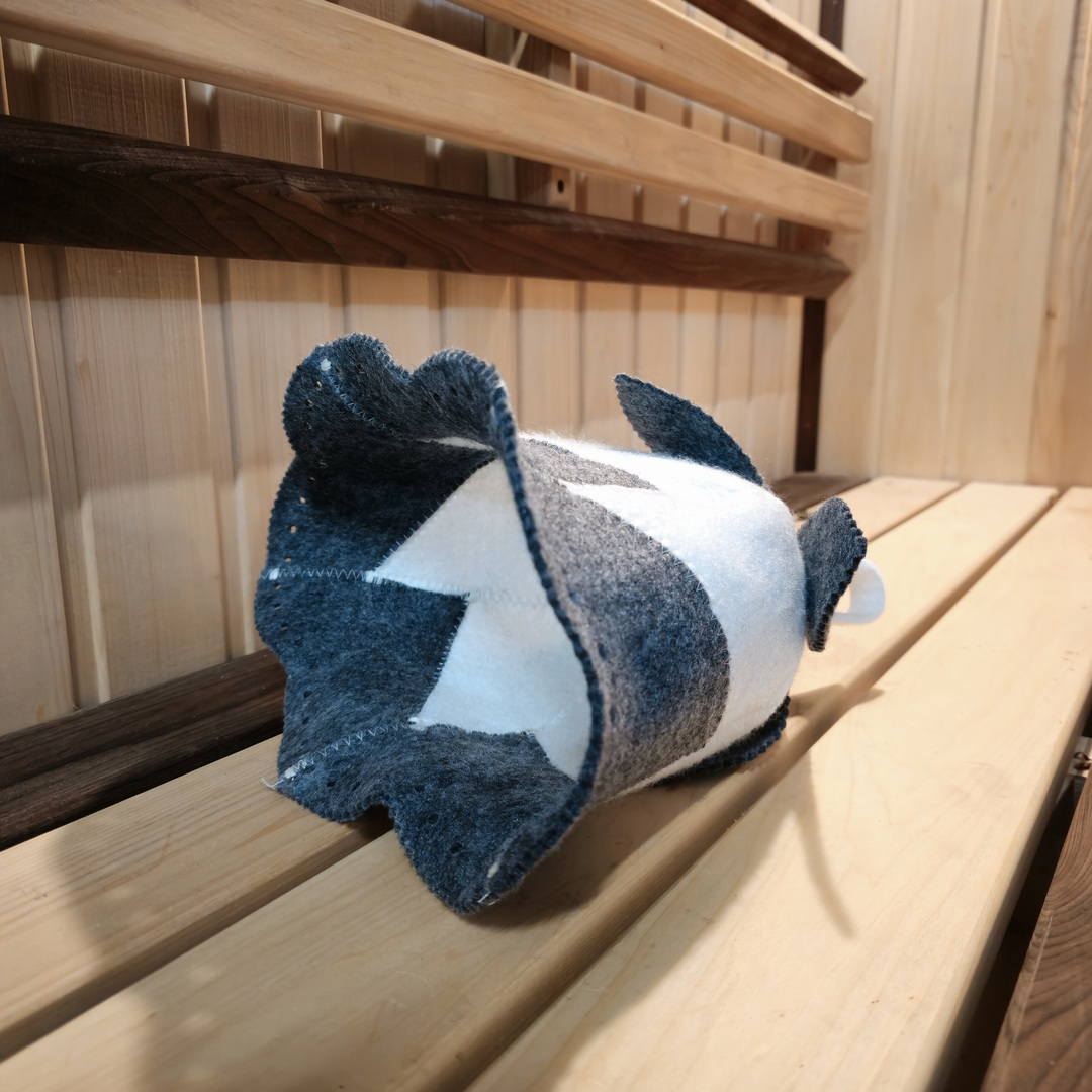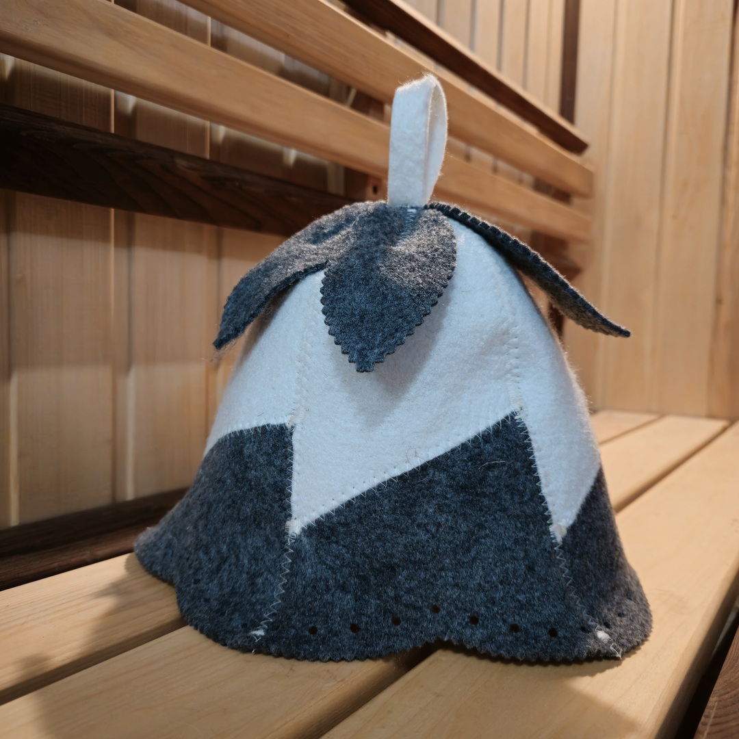 Банная шапка панама "Колокольчик" сшита из белого и серого искусственного войлока в форме цветка колокольчик.