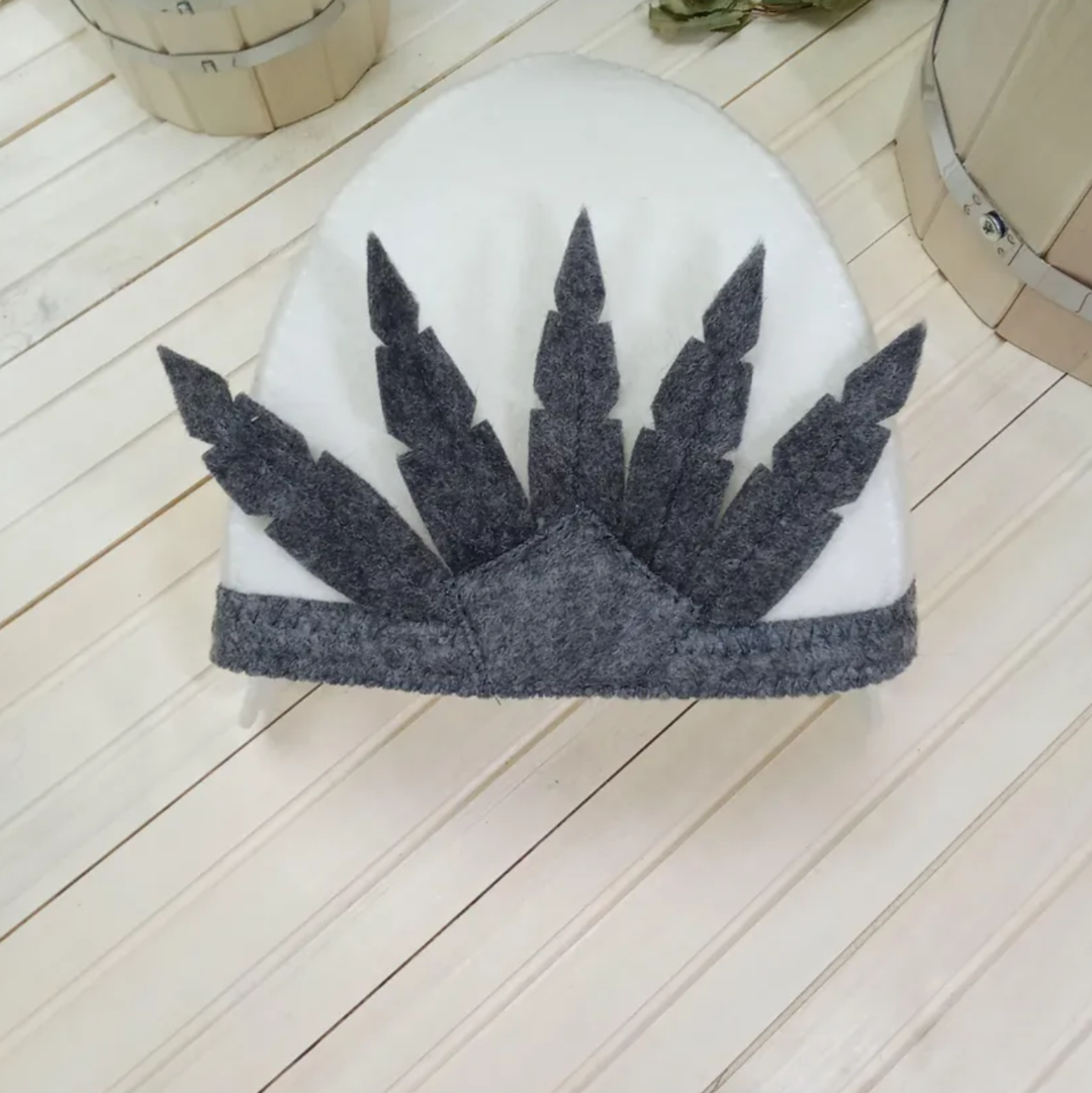 Шапка изготовлена из войлока белого цвета и задекорирована перьями серого цвета.