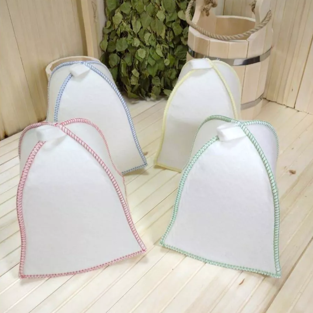 Банная шапка-колпак из светлого войлока с цветной отстрочкой.