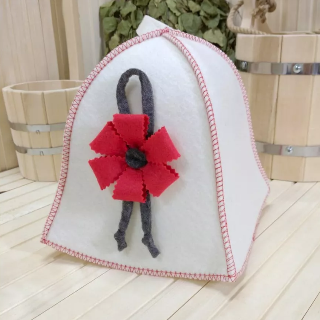 Эта милая банная шапка-колпак защитит Вас от теплового удара в парилке и убережёт волосы от горячего воздуха, который делает их ломкими и секущимися. Не забывайте надевать ее перед тем каждым заходом в парную. Шапка изготовлена из неплотного войлока светлого оттенка и украшена сбоку красным цветочком.