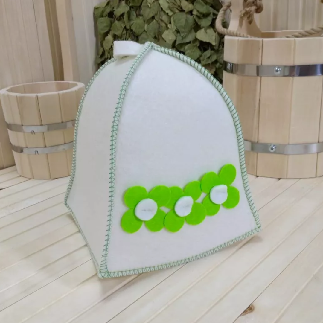 Шапка для бани белая "Маленькие зеленые цветочки" ТМ "Жар-банька"