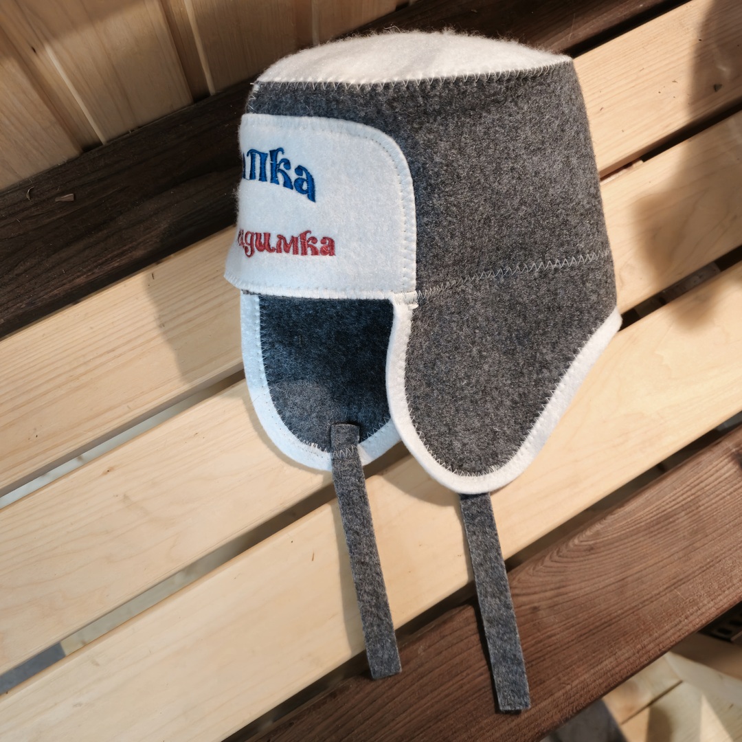 Банная шапка ушанка "Шапка Невидимка" сшита из серого и белого искусственного войлока.