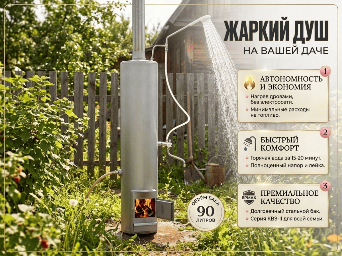 Водогрейная колонка на дровах Ермак КВЭ-II-90 со встроенной топкой и стальным баком - это универсальный водонагреватель для загородного дома и дачи, на который устанавливается специальный смеситель и душ (опция). Это устройство для нагрева воды и принятия душевых процедур там, где отсутствует горячее водоснабжение.
