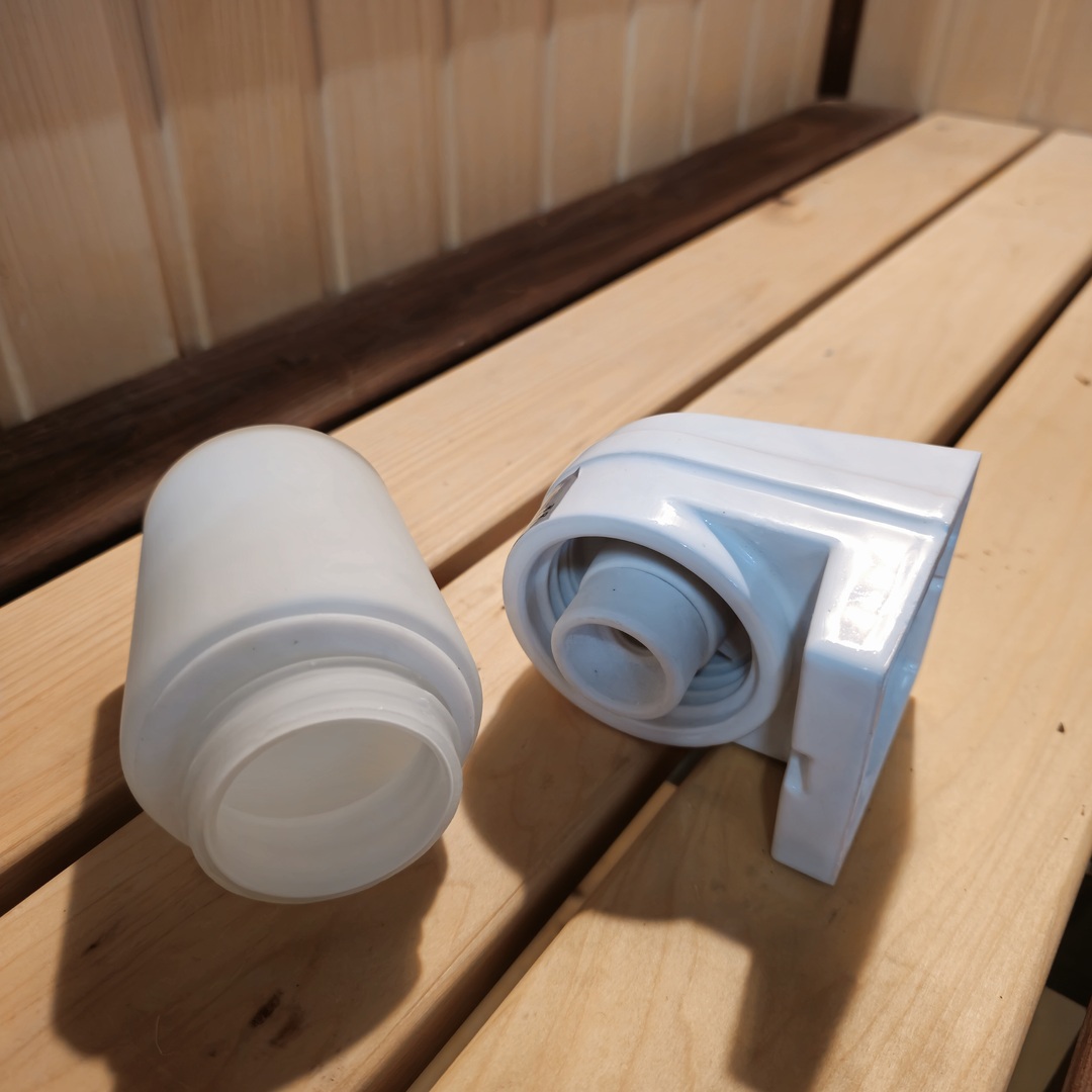 Корпус светильника изготовлен из керамики белого цвета (глянцевая), плафон из силикатного термостойкого стекла белого матового цвета. Между корпусом и плафоном установлено силиконовое уплотнение для защиты от проникновения пара, брызг воды и пыли.