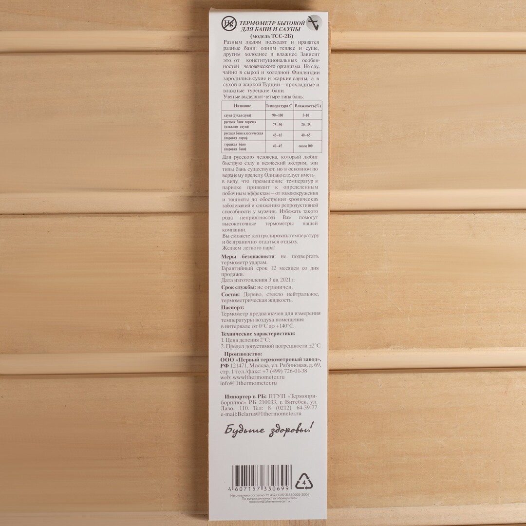 Термометр оснащён простой и понятной шкалой до 140℃, которая позволяет легко отслеживать температуру в помещении. Шкала делится на удобные деления, что обеспечивает точные и быстрые показания. Этот прибор поможет вам контролировать оптимальный микроклимат, что особенно важно для комфортного отдыха и здоровья.