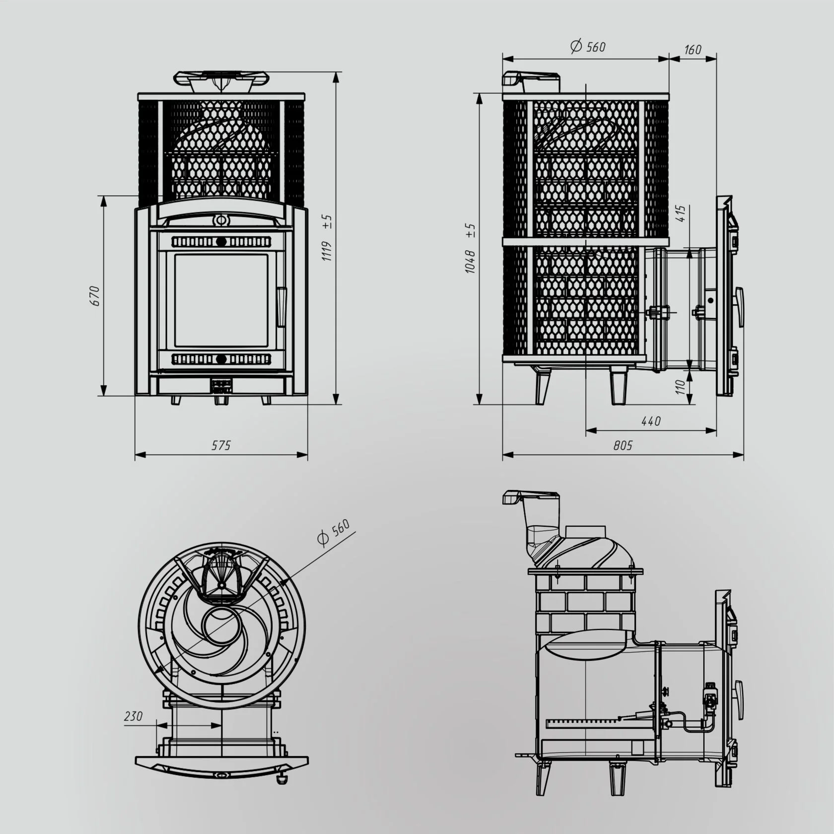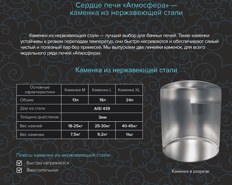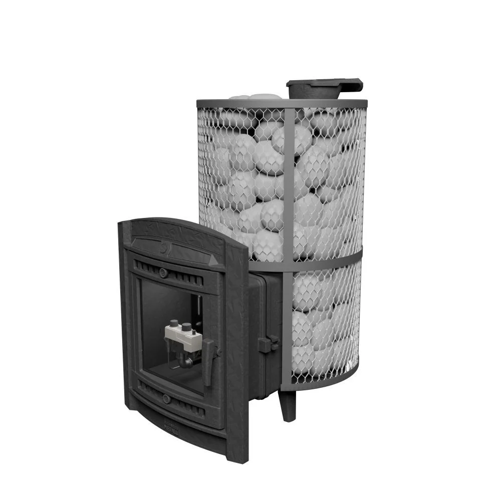 Печь изготовлена методом литья из высококлассного чугуна ЧХ-1. Внутренняя каменка изготовлена из нержавеющей стали AISI439 и оснащена паровой пушкой. Наличие внутренней и внешней каменки дают возможность выбрать подходящий на данный момент режим прогрева парной. Кожух печи изготовлен в виде сетки из нержавеющей стали, которая полностью заполняется камнями для бани, тем самым обеспечивая высокую динамику нагрева парильного помещения.