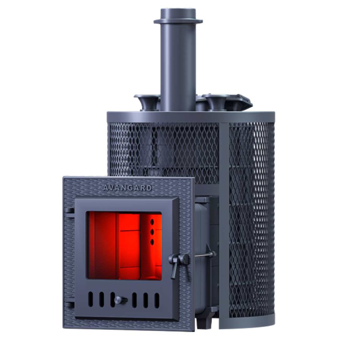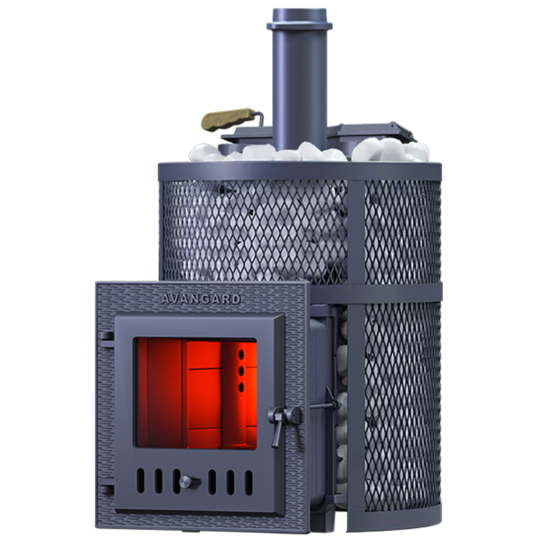 Пароиспаритель печи AVANGARD весит 51 кг и нагревается за счёт прямого контакта с пламенем. У пароиспарителя две рабочие поверхности с увеличенной площадью: нижняя часть получает тепло от огня, верхняя часть подводит воду для образования пара. Под каменкой установлена массивная каменка с теплоаккумулирующими воронками, которые формируют легкий пар.
