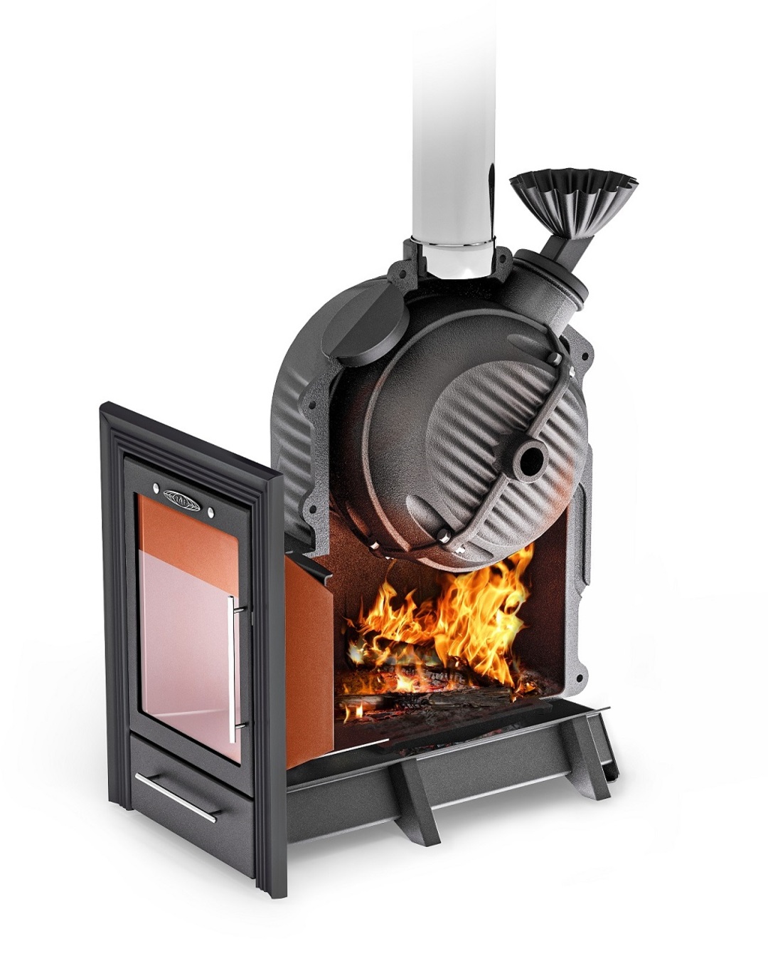 • Каменка расположена по центру топки и более половины ее поверхности греется тепловым излучением от пламени