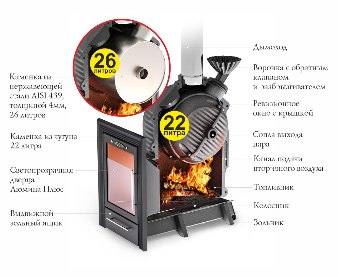Чугунная печь Чёрная жемчужина Люмина Плюс Cast для русской паровой бани с внутренней закрытой каменкой из чугуна. От других чугунных печей эту печь отличает, прежде всего, очень большой объем внутренней закрытой каменки, более половины поверхностей которой нагреваются тепловым излучением от пламени, и относительно небольшой объем топки для исключения перегрева парной.
