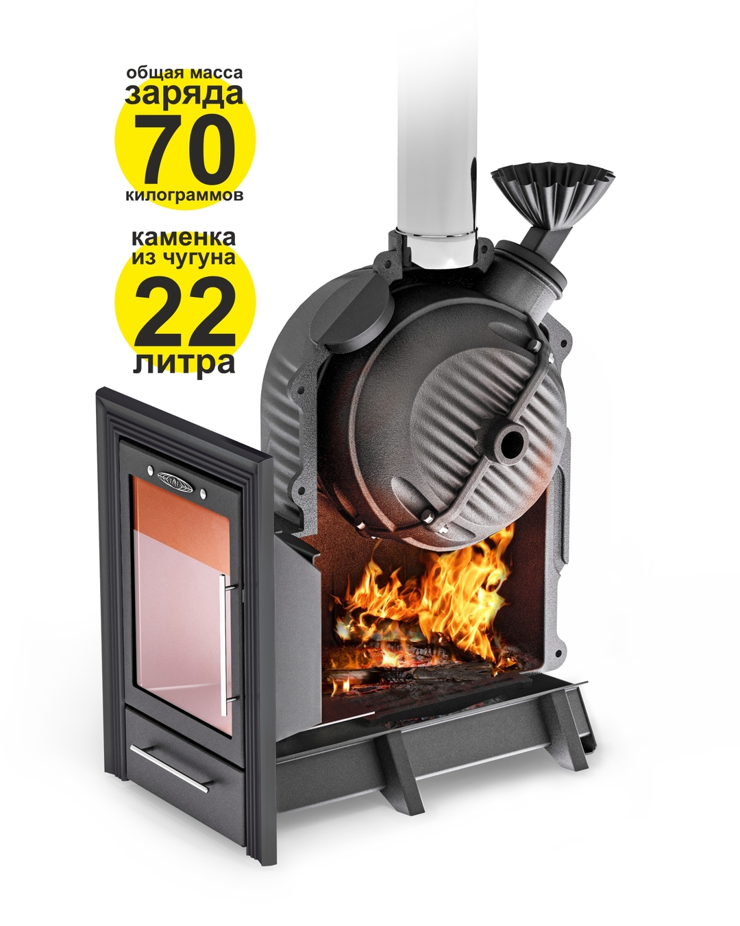 • Внутренняя каменка из чугуна объемом 22 литра вмещает 33 кг камней. Масса деталей чугунной каменки 37 кг увеличивает общую массу теплоаккумулирующего заряда до 70 кг