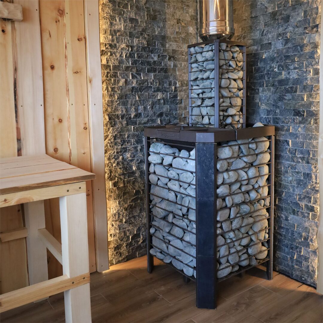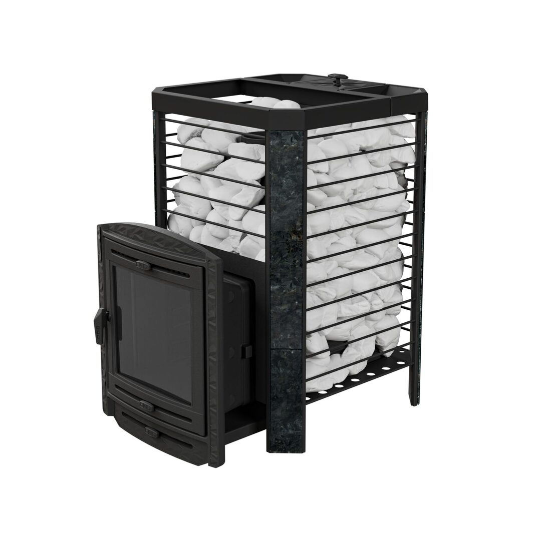Кожух печи изготовлен в виде сетки из нержавеющей стали с прямоугольными ячейками и полностью заполняется природными камнями, обеспечивая высокую динамику нагрева парильного помещения.