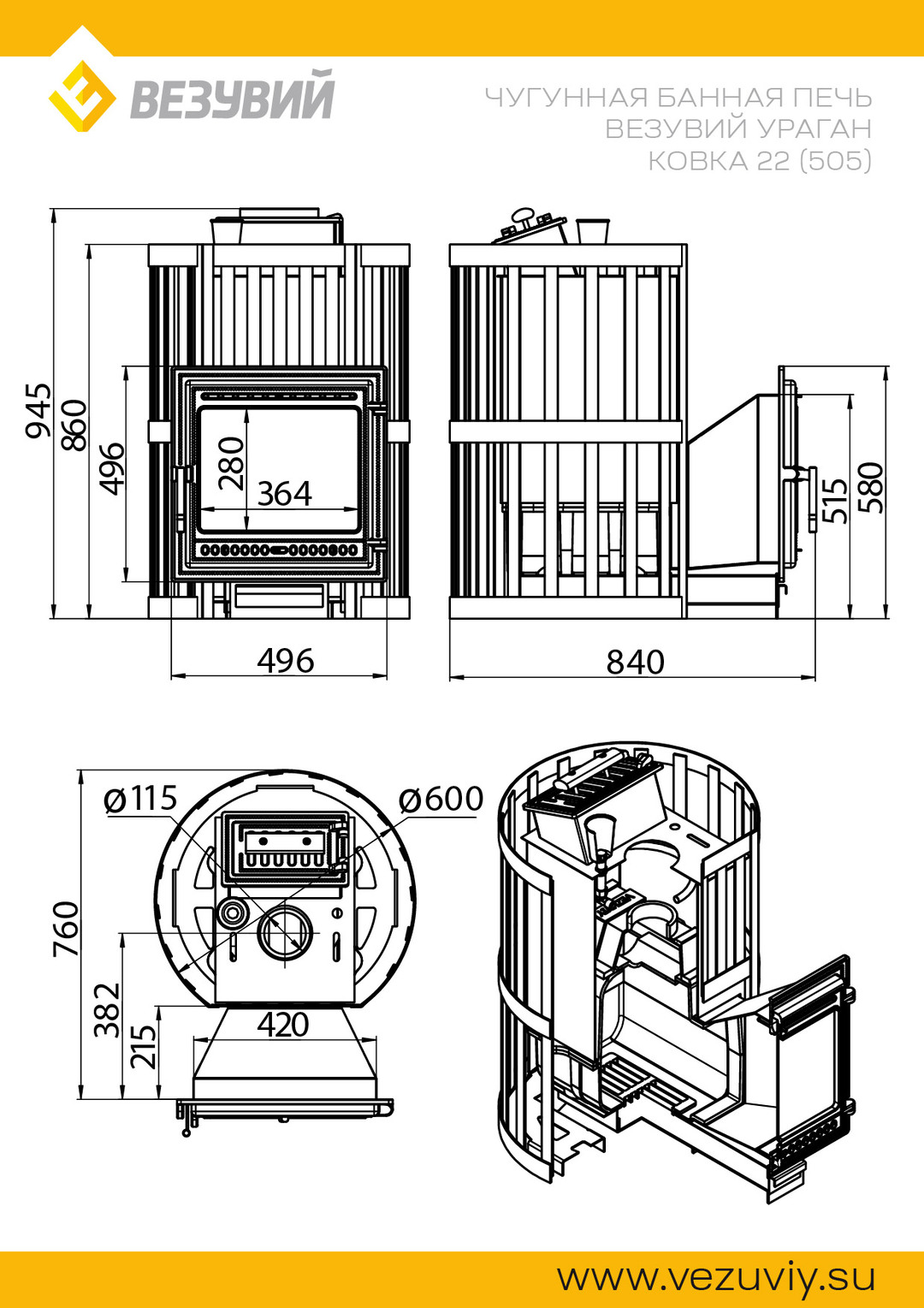 Банная чугунная печь Ураган Ковка 22 (505) комплектуется чугунной герметичной дверцей Везувий 505 с жаропрочным стеклом SCHOTT ROBAX.