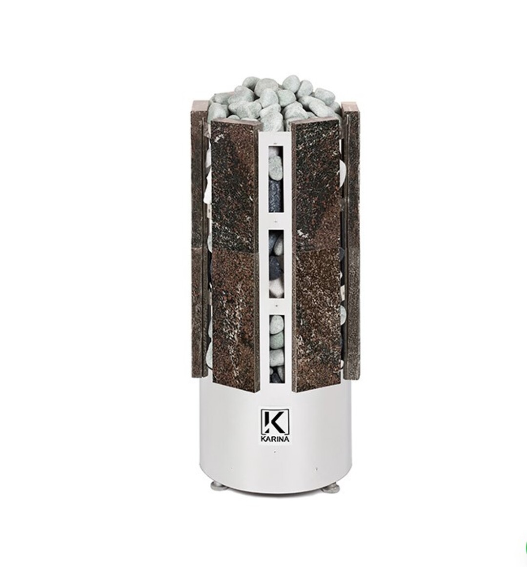 Печь KARINA Forta Амфиболит выполнена в напольном варианте и обладает цилиндрической формой дополненной плитами из натурального камня Амфиболит. Данная модель имеет тэны, расположенных в виде треугольника.