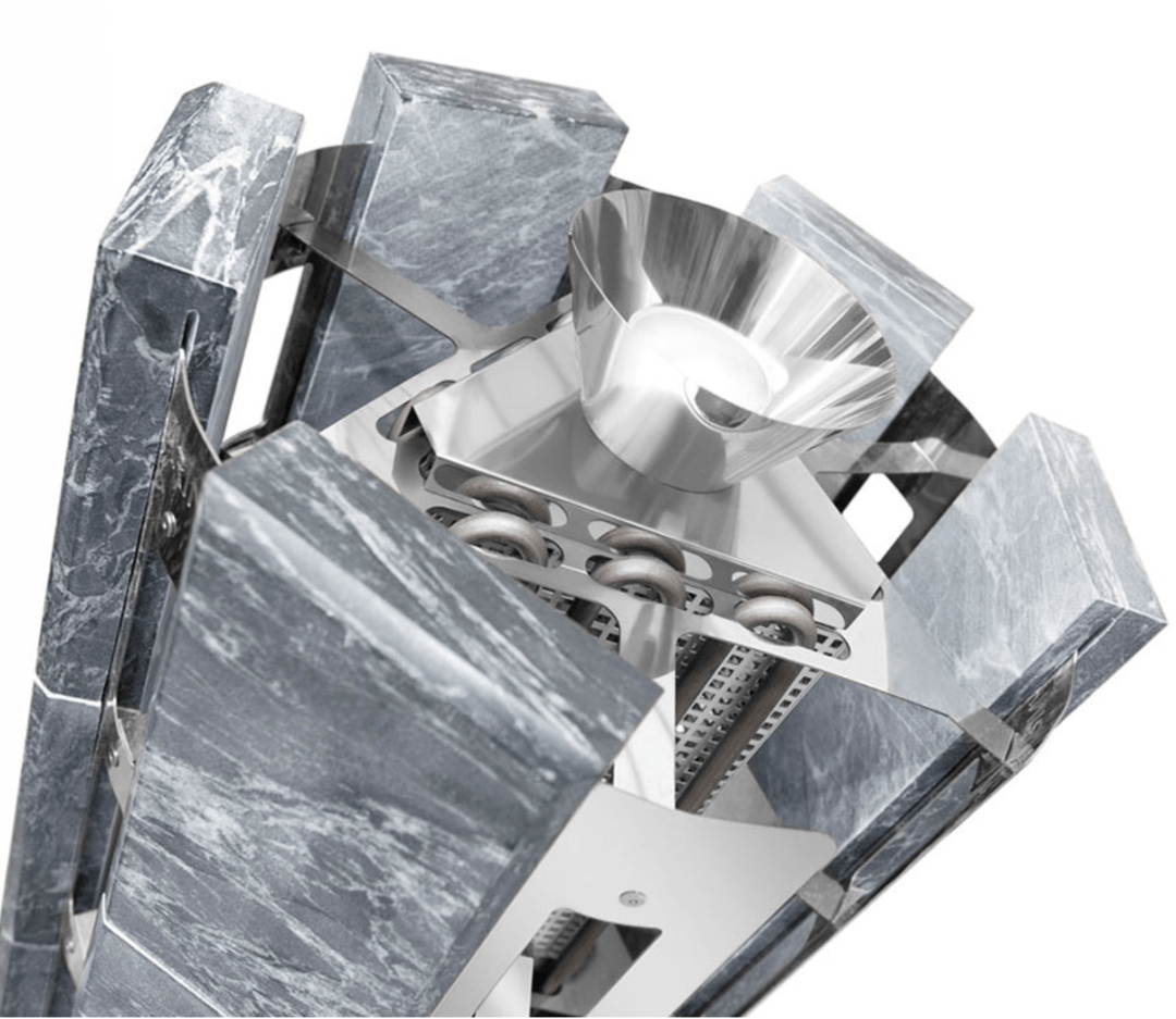 Выше парогенератора имеется емкость под мелкие камни или нержавеющие шары объемом от 2.5 до 4,7 л, вмещающая от 5 кг до 10 кг (в зависимости от модели) мелкого камня, называемая закрытой каменкой с воронкой для подачи воды и получения мелкодисперсного пара.