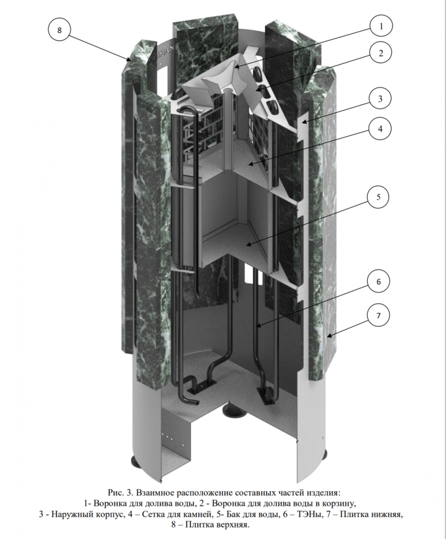 Все корпусные элементы печи выполнены из нержавеющей стали. Нагревательный элемент - ТЭН диаметром 10мм. Наружный кожух каменки дополнительно облицован плитами из Онего Грин толщиной 40мм, что придает ей еще большую теплоемкость и меньшее излучение от металлических элементов, которые выжигают воздух в парной. Общий вес камней составляет 160кг (загрузка печи 100кг и вес облицовки 60кг). Вес камней сопоставим с закладкой в хорошую дровяную печь, тем самым с помощью парогенератора, закрытой каменки и закладки камня в 160 кг, легко достигается режим настоящей русской бани.