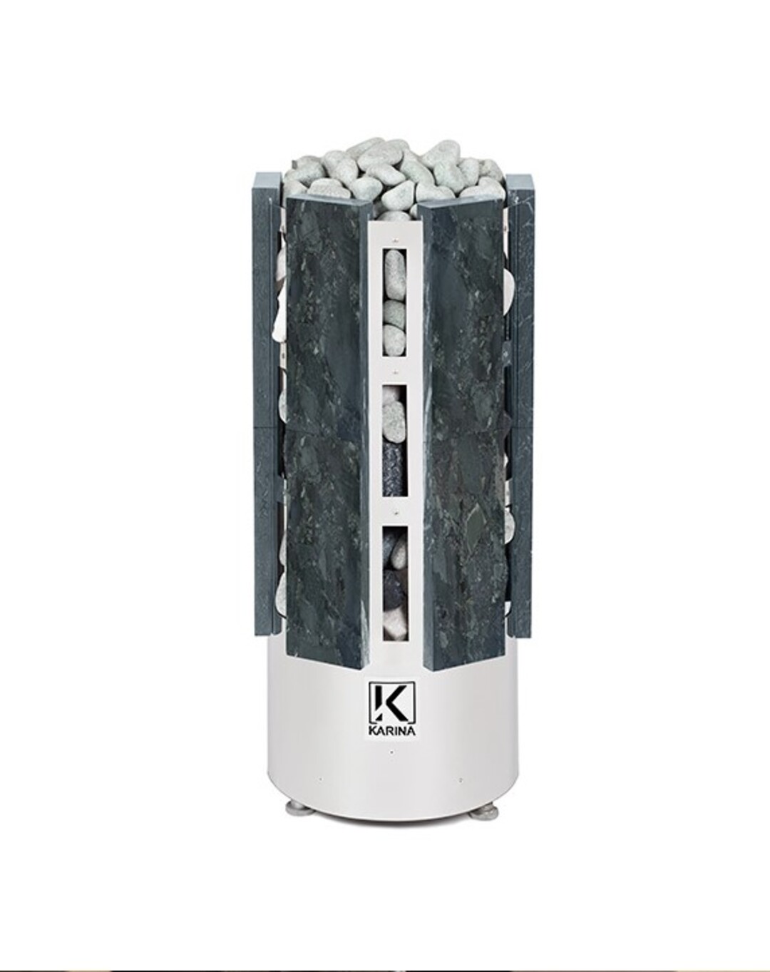 Электрокаменка Karina Forta Онего Грин предназначена для использования в парных объемом от 8м3 до 38м3. Печь выполнена в напольном варианте и обладает цилиндрической формой дополненной плитами из натурального камня Онего Грин. Данная модель имеет тэны, расположенных в виде треугольника.