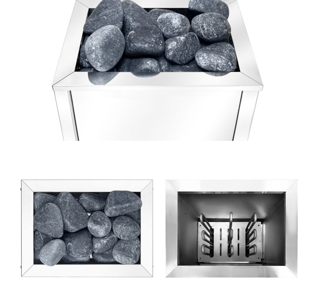 Нагревательным элементом в печке является ТЭН из высококачественной нержавеющей стали. Его диаметр составляет 10 мм. Подобные нагреватели не боятся попадания влаги. Это позволяет устанавливать электрическую каменку как в финские сауны с «сухим» паром, так и в русские традиционные бани с повышенной влажностью, потому что на камни, находящиеся в электропечи можно спокойно лить воду для повышения влажности пара.