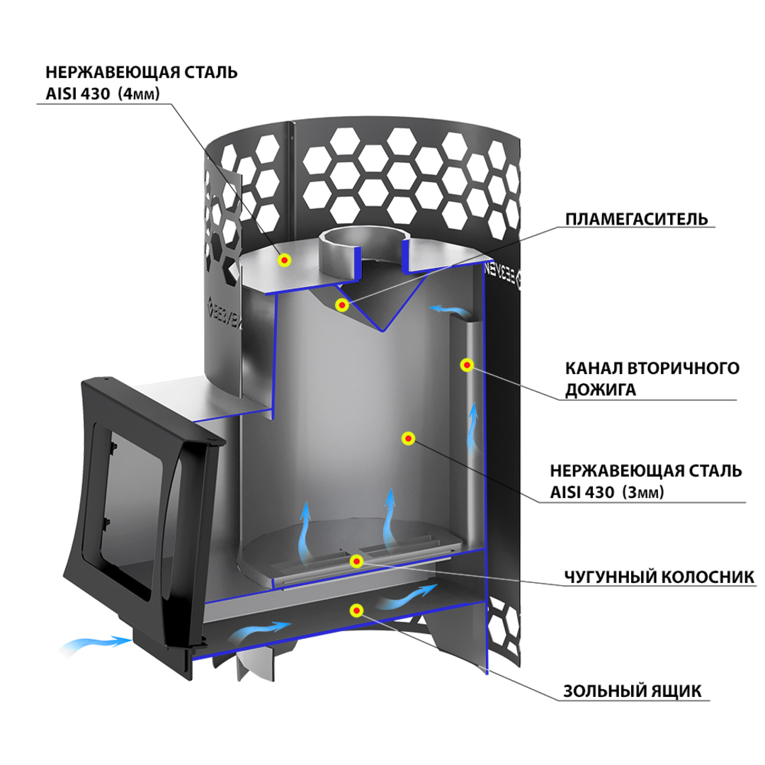 Печь сделана из нержавеющей стали AISI 430 с толщиной стенок от 3 до 4 мм. Дизайн корпуса печи выполнен в виде сот. Диаметр дымохода 115 мм. Дверка имеет правое и левое открытие. Улучшенная загрузка дров благодаря расположению двери под углом.