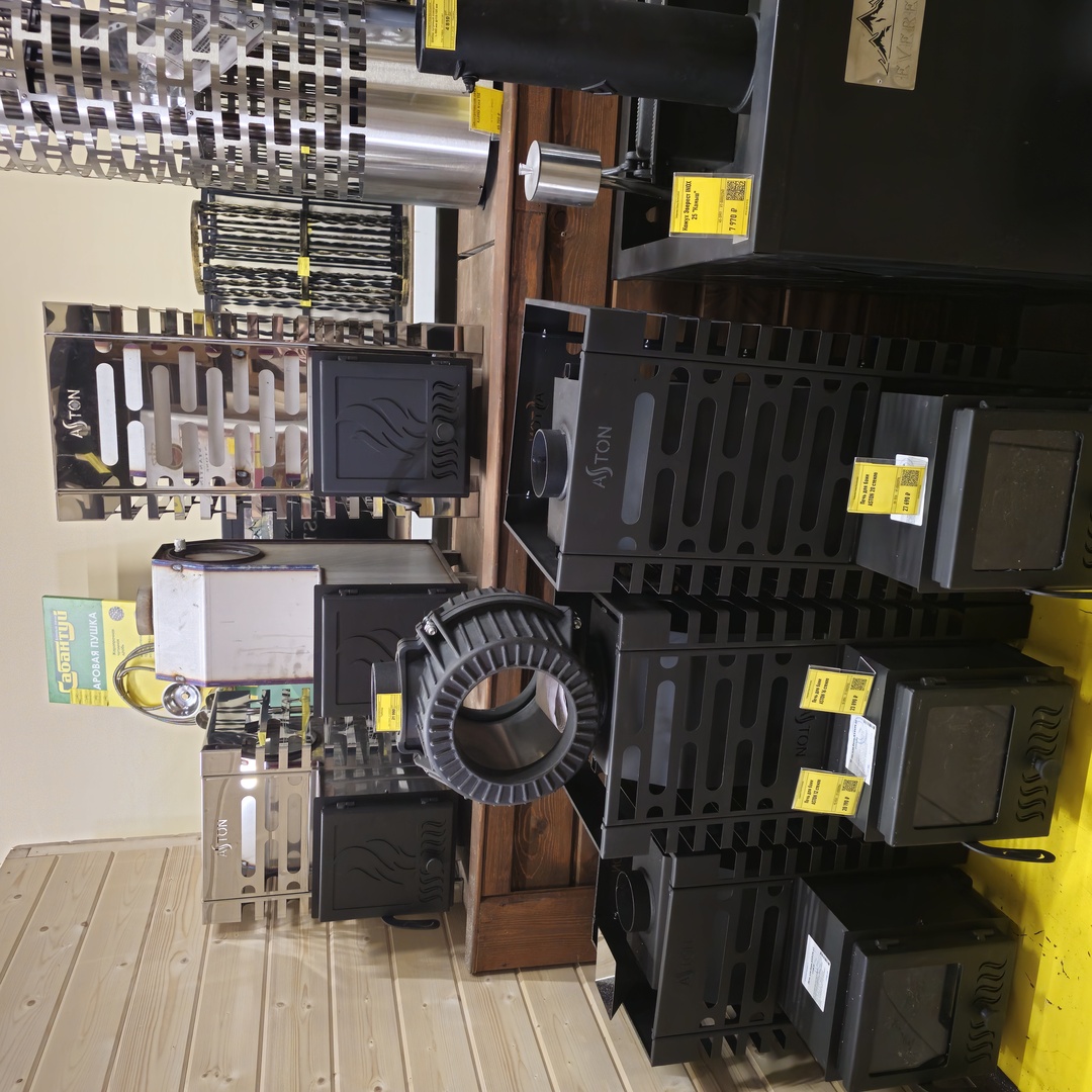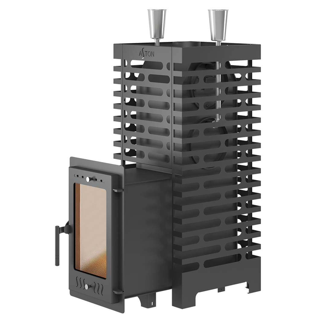 Бренд ASTON выпускает печи для бюджетных парных и бань-бочек. Несмотря на доступность, их конструкция заслуживает внимания: выполняются из стали повышенной прочности 09Г2С; каменка закрытого типа для легкого получения пара; это печи-каменки с сеткой-кожухом для камней.