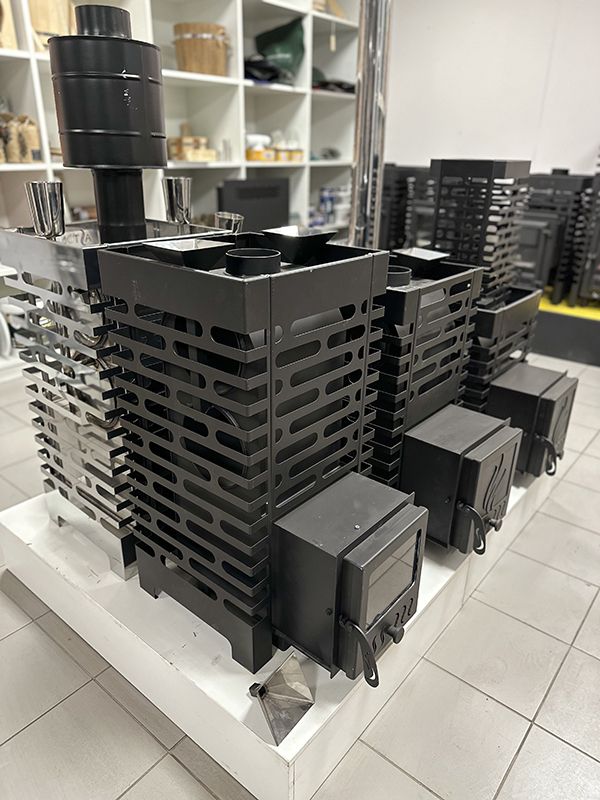 - большая масса камней, размещаемых в сетке-кожухе печи, поддерживает стабильную температуру в парилке и служит мощным парогенератором