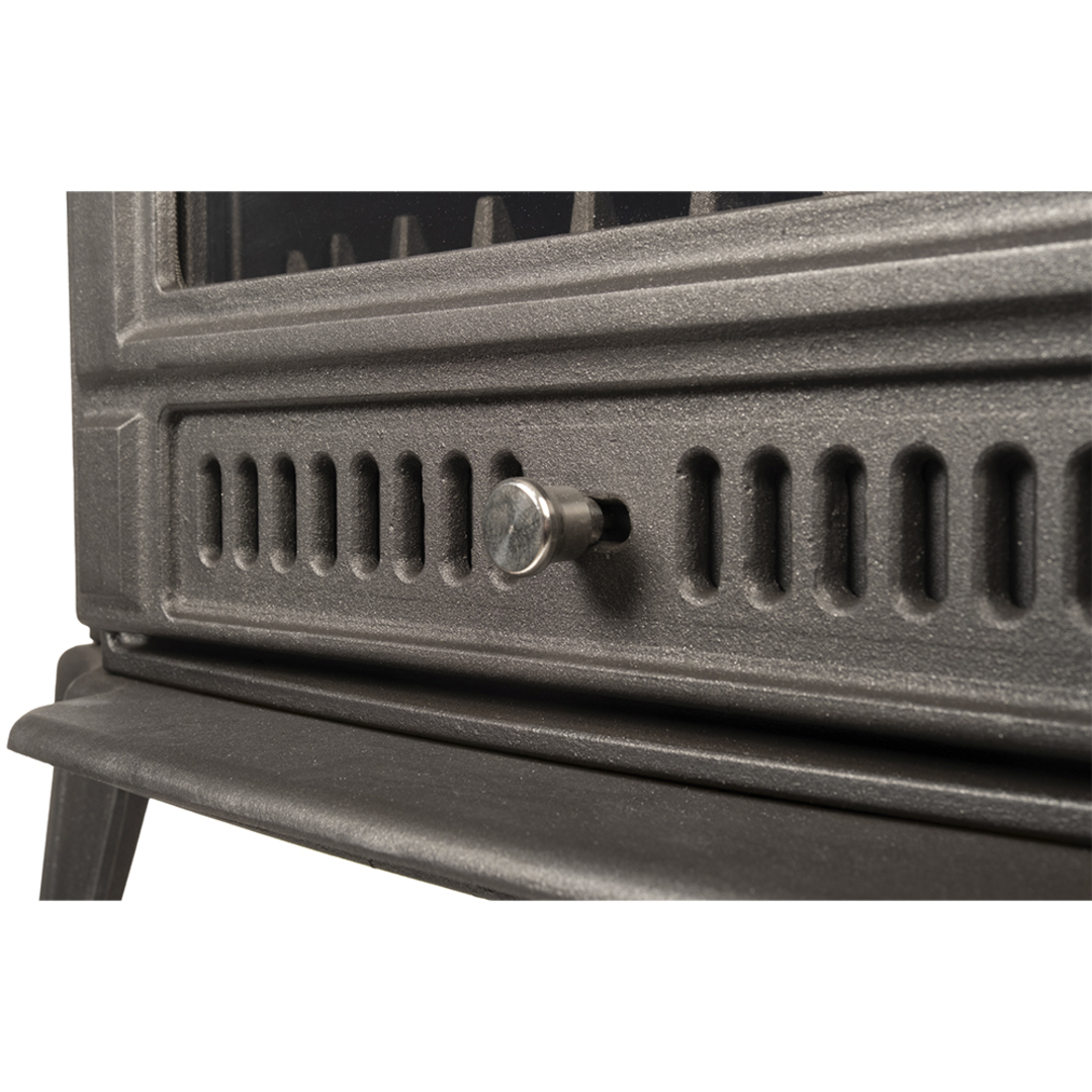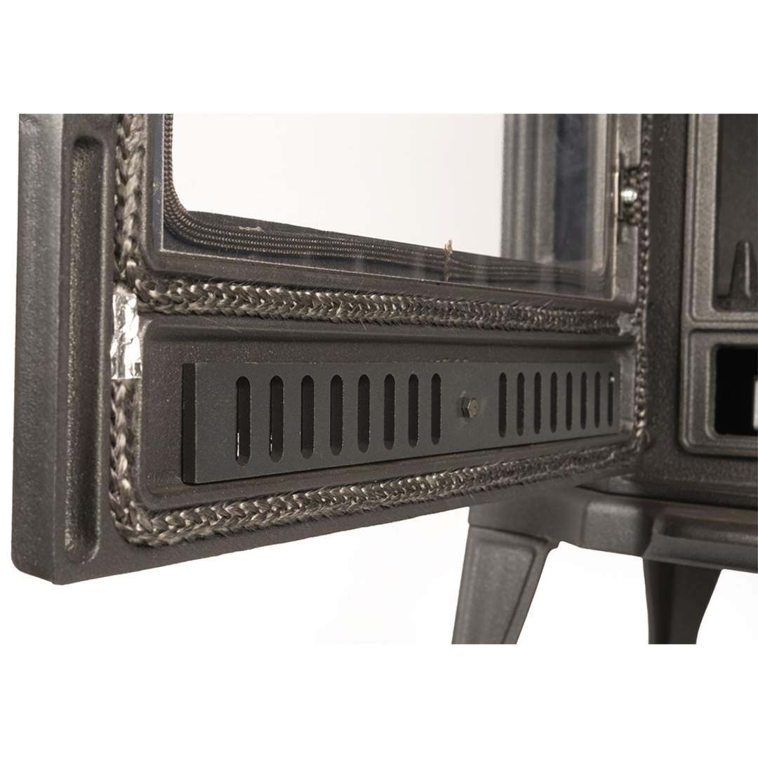 - Система "Чистое стекло", поддерживающая чистоту стекла во время работы. Уникальная подача воздуха на внутреннюю сторону стекла эффективно отсекает дымовые газы и пламя, предотвращая их закопчение и потемнение. Для вашего удобства ручка управления системой расположена в верхней части передней панели, позволяя легко контролировать процесс горения. Кроме того, в нижней части двери находится ручка задвижки для подачи воздуха на первичное горение.