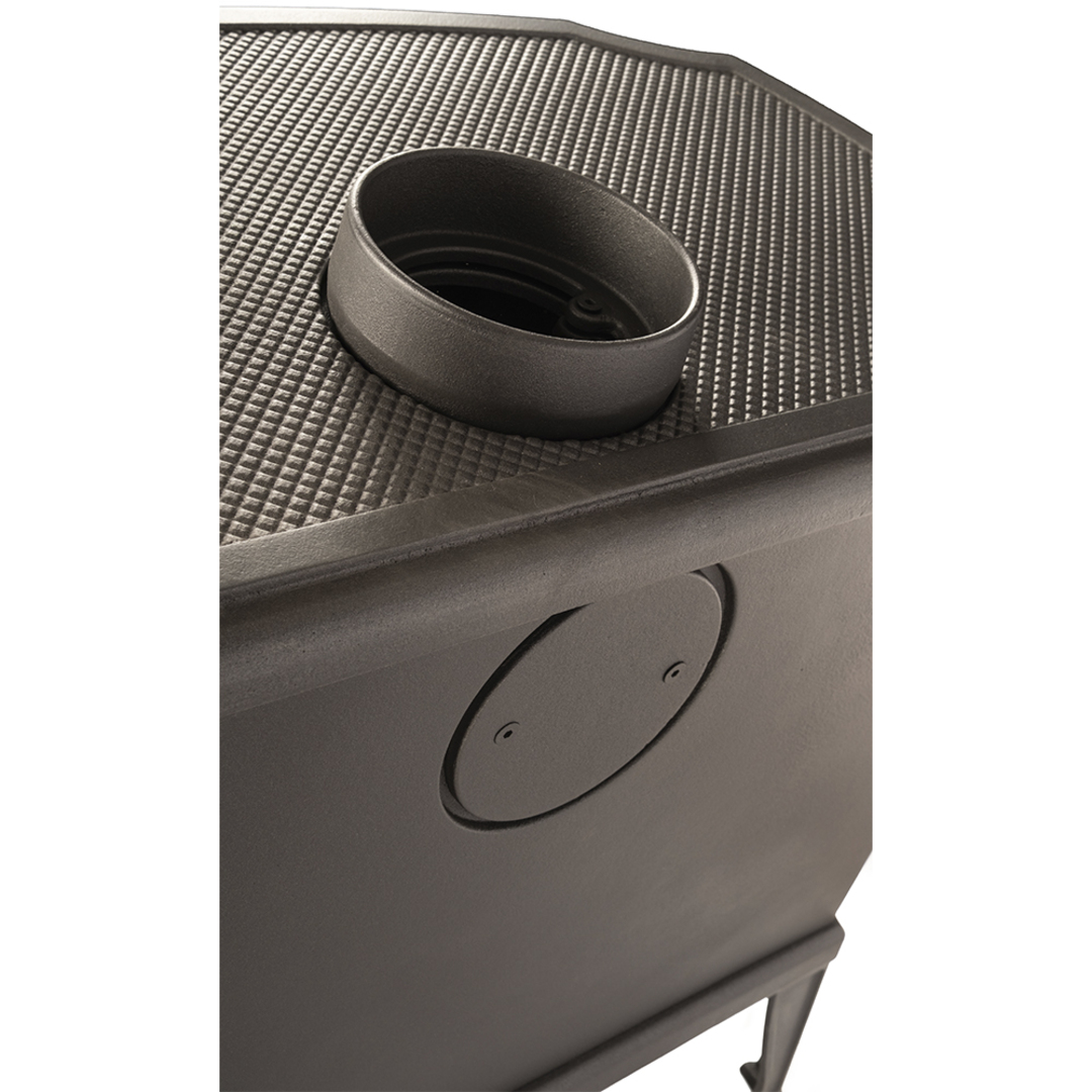 Печь-камин соединяется с дымоходом диаметром 150 мм. Подключение возможно сверху, а также предусмотрен вывод по задней части.