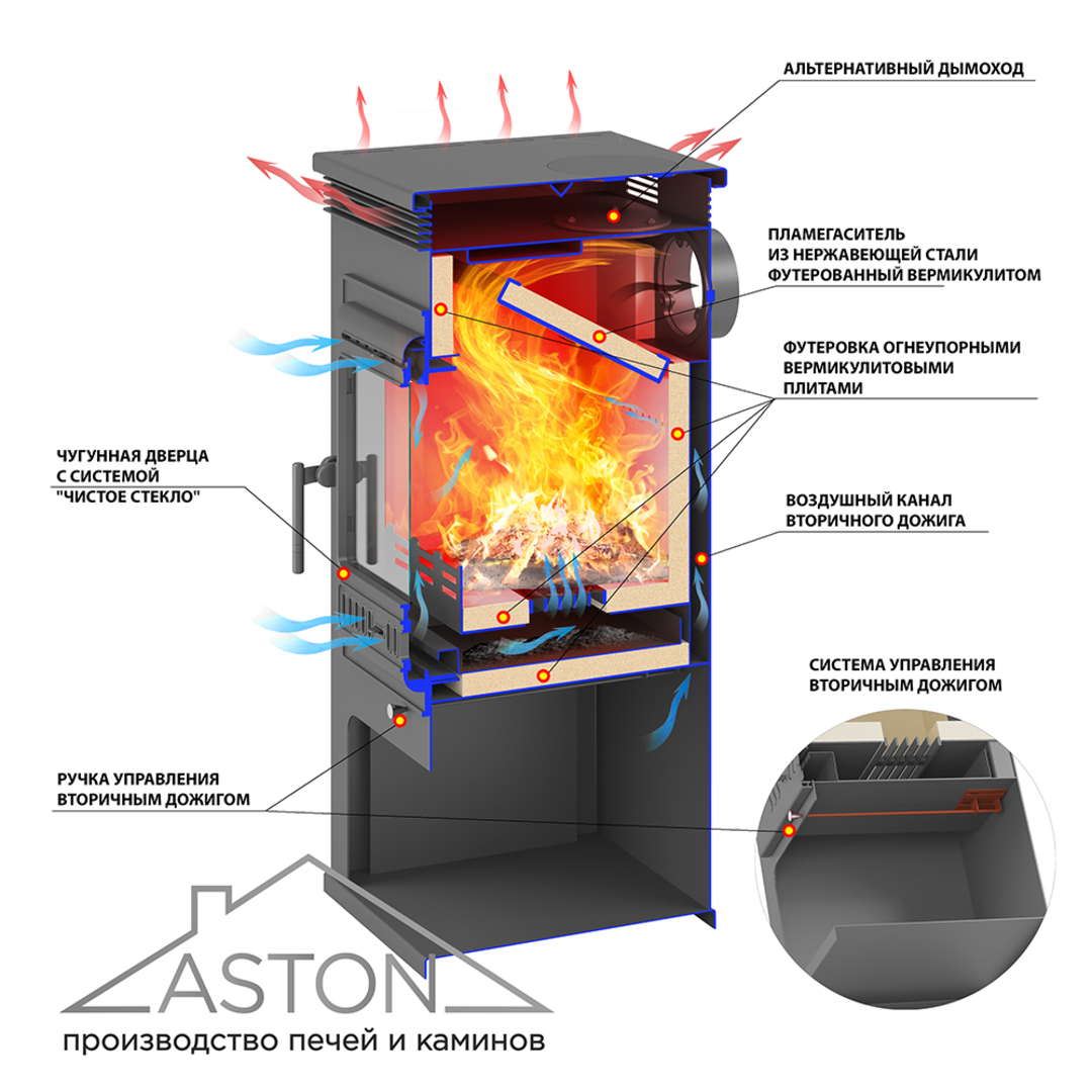 На задней стенке топочной камеры размещён канал для подачи воздуха на вторичный дожиг. П‑образный профиль из нержавеющей стали толщиной 2 мм расположен заподлицо с облицовкой и проходит от поддувала к верхней части топки.