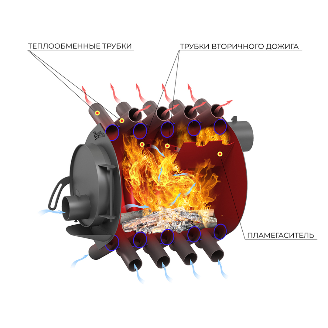 Две камеры сгорания — нижняя камера газификации и верхняя камера дожига газов — обеспечивают почти полное сгорание топлива и максимальную отдачу энергии во время работы.