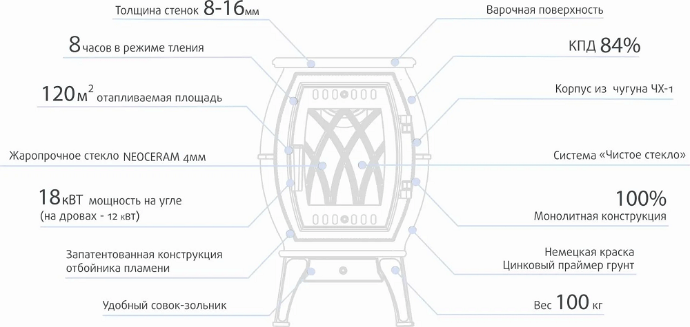Уникальной особенностью печи является запатентованная конструкция внутреннего отбойника пламени с дефлектором, а также корпуса-топки, и система регулировки подачи воздуха и удаления выходящих газов.
