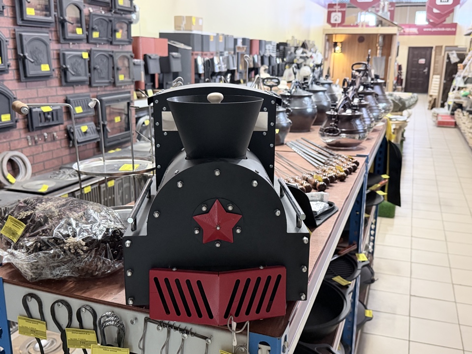 Особенностью жарового самовара модели «Самовар на шишках Паровоз», является его уникальный дизайн, выполненный в форме паровоза времен 19-20 века. Самовар предназначен для нагрева воды, для последующего употребления или для приготовления пищи.