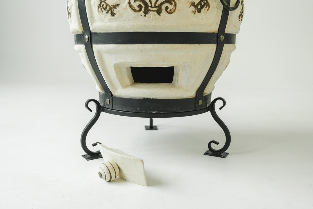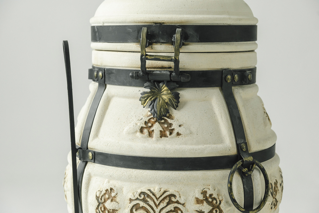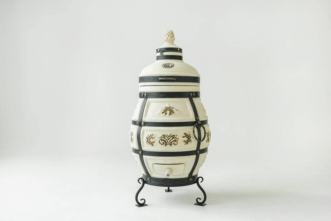 Тандыр выполнен в классическом дизайне с декоративным орнаментом и глазурованными элементами, защищёнными от влаги и загрязнений.