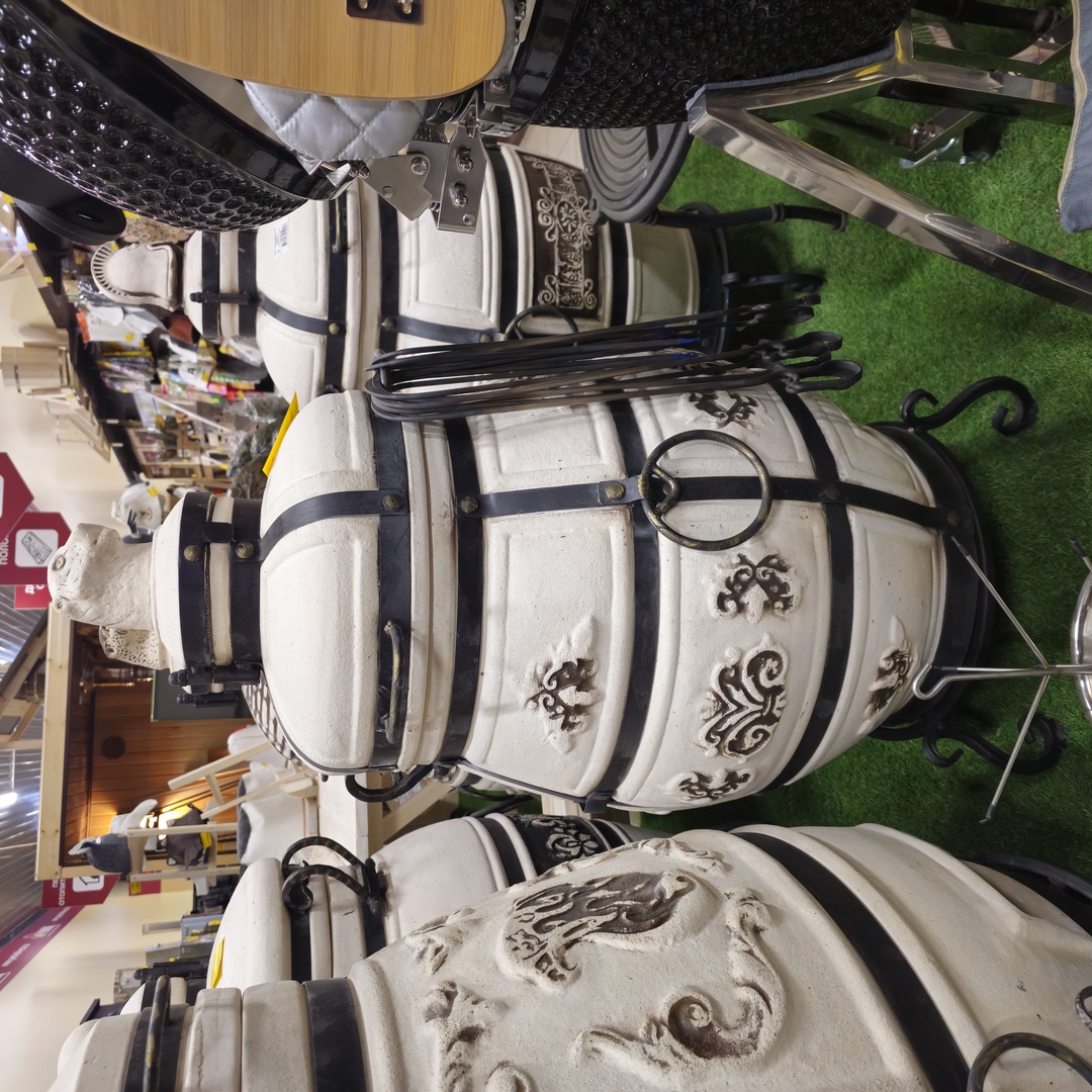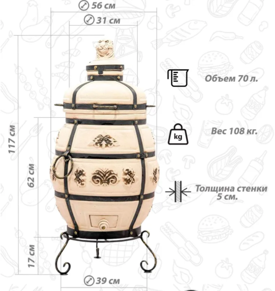 Керамический тандыр "Александр" выполнен в виде округлого бочонка большого объёма. Крышка с удобными ручками позволяет легко открывать тандыр и закладывать в него продукты для приготовления. Кованная подставка - ножки обеспечивает удобное использование тандыра. Особую красоту ему придаёт интересный орнаментальный растительный узор, расположенный в центральной части тандыра. Керамический тандыр в основном выполнен в бежевом цвете, коричневый цвет добавлен в области орнамента. На поверхность орнамента нанесена глазурь, которая защищает его от влаги и грязи. Изготовленный из шамотной глины высокотемпературного обжига, которая обладает высокой теплопроводностью, экологичностью, прочностью и долговечностью.