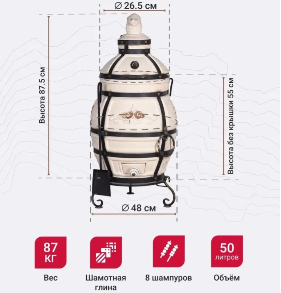 * Удлиненная кочерга, позволяет удобно справляться как с большими дровами, так и с углями на дне тандыра, избегая контакта кожи рук с жаром от углей и огня. * Имея плотно прилегающую крышку и толстые стенки, тандыр длительное время поддерживает высокую температуру. Это позволяет более равномерно прожаривать даже самые крупные куски мяса.