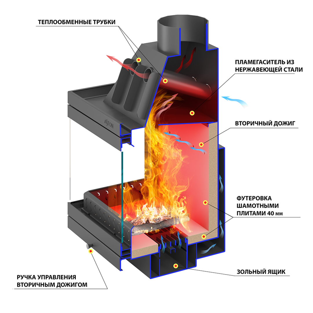 Топка оборудована системой вторичного дожига дымовых газов, которая позволяет получить максимум энергии при горении дров. Каналы вторичного дожига расположены на задней стенке топочной камеры прямо в шамотной облицовке.