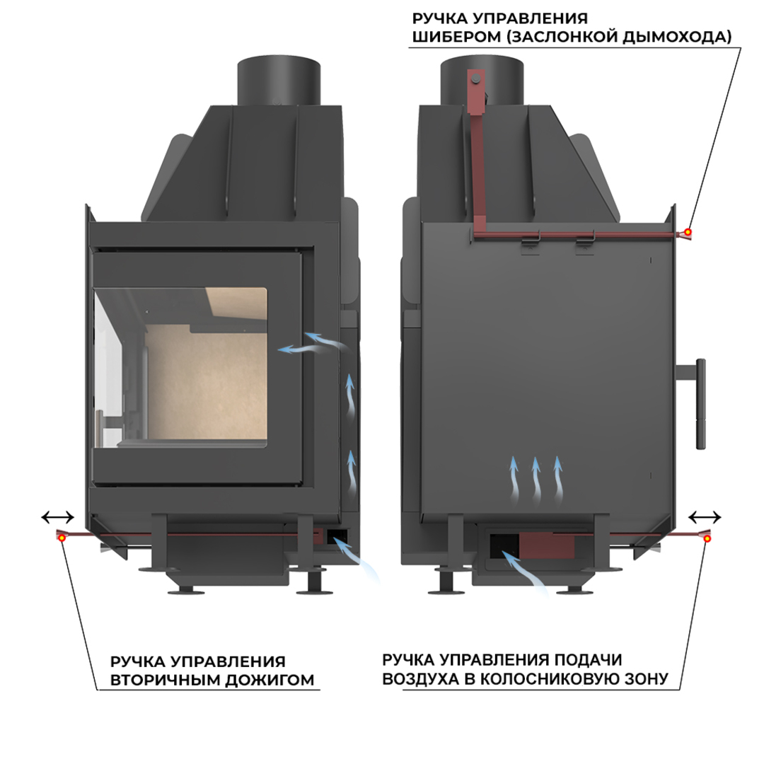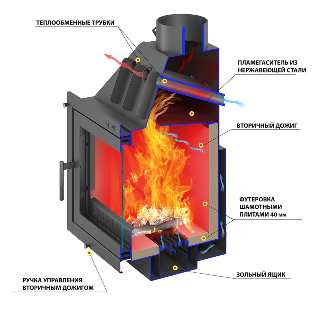 Топка оборудована системой вторичного дожига дымовых газов, которая позволяет получить максимум энергии при горении дров. Каналы вторичного дожига расположены на задней стенке топочной камеры прямо в шамотной облицовке.