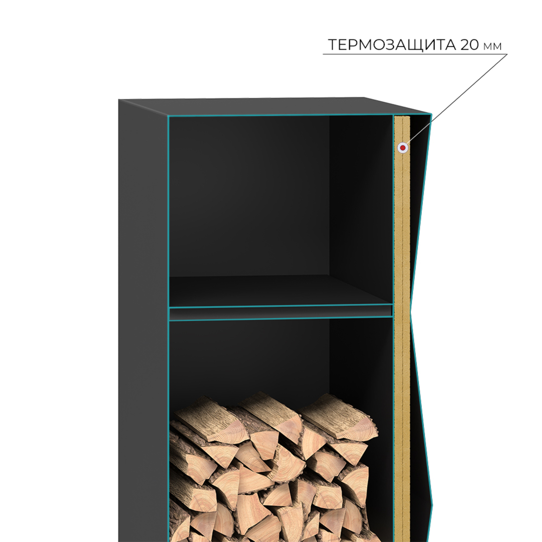 Дровник изготовлена из прочной стали 09Г2С в цвете Антрацит. Он предназначен для хранения и сушки дров длиной до 530 мм, а также служит элементом дизайна и удобства. Между внешней изогнутой стенкой и внутренней прямой стенкой дровницы уложена минеральная вата толщиной 20 мм. Промежуток между дровником и отопительным оборудованием должен быть таким, чтобы температура внутри дровника не превышала температуры воспламенения находящихся внутри предметов.