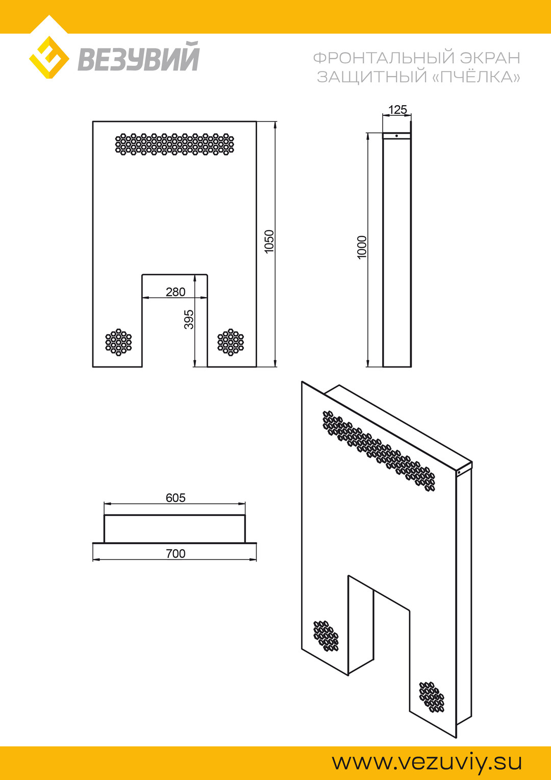 Фронтальный защитный экран сделан в виде П-образной арки, которая обрамляет топочную дверку и топочный тоннель печи. Передняя панель экрана имеет толщину 2 мм, остальные элементы – толщиной 1 мм. Небольшой борт по периметру передней панели позволяет красиво отделать экран и скрыть швы между экраном и стеной.